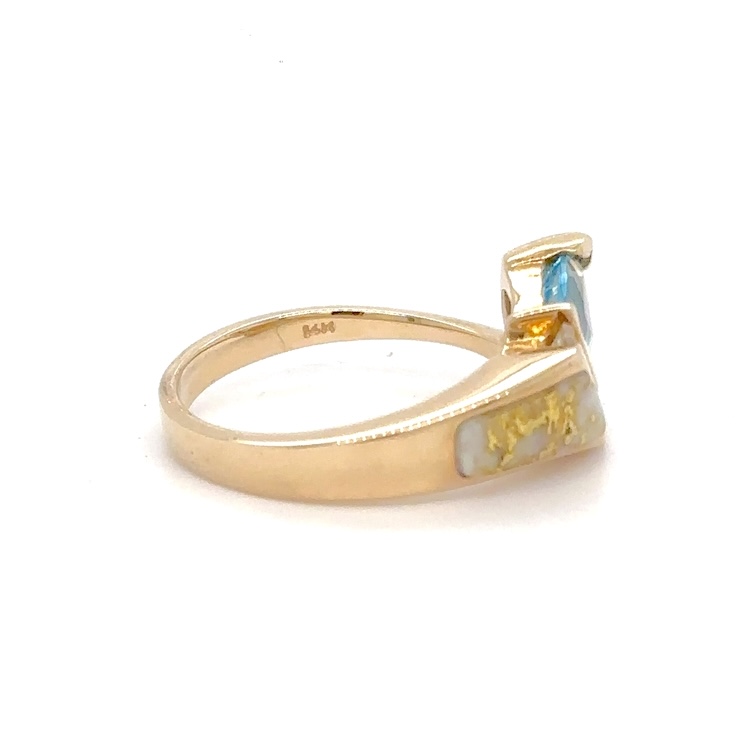 The ring features a natural gemstone known as “Gold Bearing Quartz,” typically mined from deep underground. In most cases, gold found in quartz exists in microscopic amounts, making it virtually invisible. However, this ring boasts an extraordinary rarity as it showcases a very scarce stone that is first cut into slabs, revealing the precious gold vein. Skilled artisans cut, shape, polish, and mount the gold quartz into a 14k gold setting. Embrace the allure of this remarkable Gold Bearing Quartz ring and celebrate the natural beauty of this exceptional gemstone.
