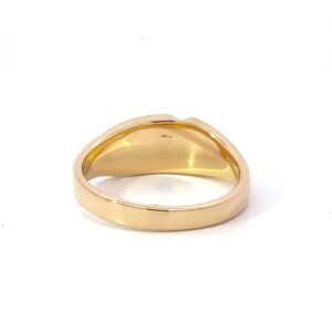 This lady’s gold quartz ring is expertly crafted in 14k yellow gold. This piece features an inlaid row of diamonds through the middle of the stone sections. The smooth, polished surface brilliantly reflects light, capturing attention from every angle. The photos showcase enlarged details of this piece.