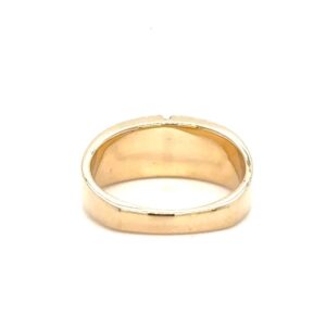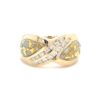 This lady’s gold quartz ring is expertly crafted in 14k yellow gold. This piece features an inlaid row of diamonds through the middle of the stone sections. The smooth, polished surface brilliantly reflects light, capturing attention from every angle. The photos showcase enlarged details of this piece.