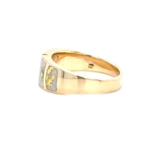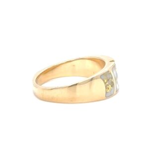 The ring features a natural gemstone known as “Gold Bearing Quartz,” typically mined from deep underground. In most cases, gold found in quartz exists in microscopic amounts, making it virtually invisible. However, this ring boasts an extraordinary rarity as it showcases a very scarce stone that is first cut into slabs, revealing the precious gold vein. Skilled artisans cut, shape, polish, and mount the gold quartz into a 14k gold setting. Embrace the allure of this remarkable Gold Bearing Quartz ring and celebrate the natural beauty of this exceptional gemstone.