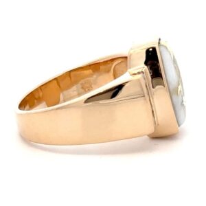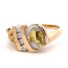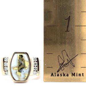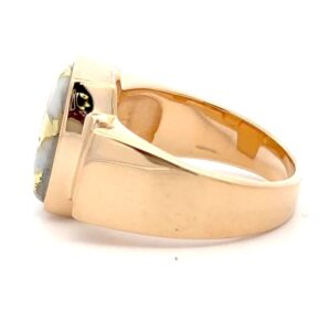 The ring features a natural gemstone known as “Gold Bearing Quartz,” typically mined from deep underground. In most cases, gold found in quartz exists in microscopic amounts, making it virtually invisible. However, this ring boasts an extraordinary rarity as it showcases a very scarce stone that is first cut into slabs, revealing the precious gold vein. Skilled artisans cut, shape, polish, and mount the gold quartz into a 14k gold setting. Embrace the allure of this remarkable Gold Bearing Quartz ring and celebrate the natural beauty of this exceptional gemstone.
