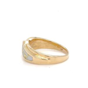 The ring features a natural gemstone known as “Gold Bearing Quartz,” typically mined from deep underground. In most cases, gold found in quartz exists in microscopic amounts, making it virtually invisible. However, this ring boasts an extraordinary rarity as it showcases a very scarce stone that is first cut into slabs, revealing the precious gold vein. Skilled artisans cut, shape, polish, and mount the gold quartz into a 14k gold setting. Embrace the allure of this remarkable Gold Bearing Quartz ring and celebrate the natural beauty of this exceptional gemstone.