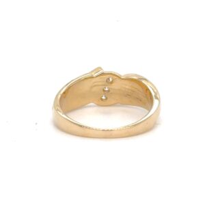 This lady’s gold quartz ring is expertly crafted in 14k yellow gold. This piece features an inlaid row of diamonds through the middle of the stone sections. The smooth, polished surface brilliantly reflects light, capturing attention from every angle. The photos showcase enlarged details of this piece.