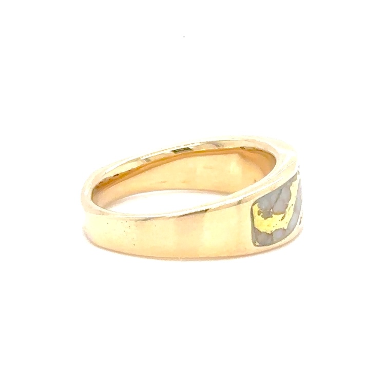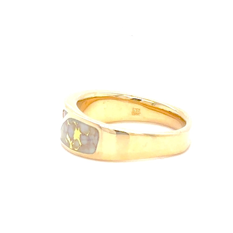 The ring features a natural gemstone known as “Gold Bearing Quartz,” typically mined from deep underground. In most cases, gold found in quartz exists in microscopic amounts, making it virtually invisible. However, this ring boasts an extraordinary rarity as it showcases a very scarce stone that is first cut into slabs, revealing the precious gold vein. Skilled artisans cut, shape, polish, and mount the gold quartz into a 14k gold setting. Embrace the allure of this remarkable Gold Bearing Quartz ring and celebrate the natural beauty of this exceptional gemstone.