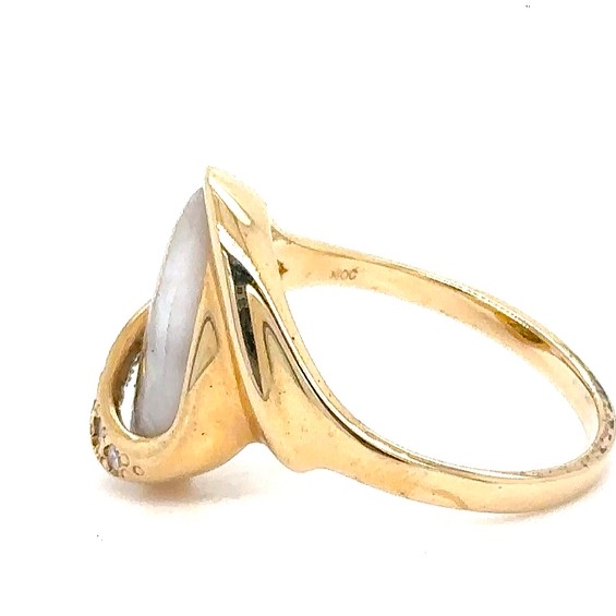 This lady’s gold quartz ring is expertly crafted in 14k yellow gold. This piece features a row of diamonds holding the stone. The smooth, polished surface brilliantly reflects light, capturing attention from every angle. The photos showcase enlarged details of this piece.