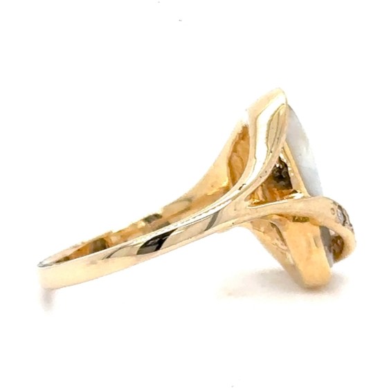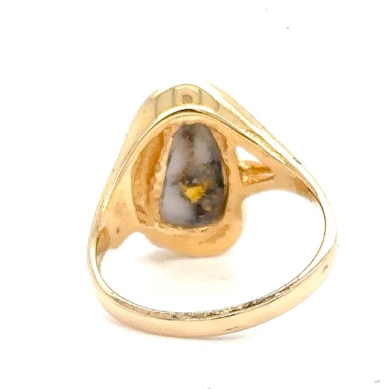 The ring features a natural gemstone known as “Gold Bearing Quartz,” typically mined from deep underground. In most cases, gold found in quartz exists in microscopic amounts, making it virtually invisible. However, this ring boasts an extraordinary rarity as it showcases a very scarce stone that is first cut into slabs, revealing the precious gold vein. Skilled artisans cut, shape, polish, and mount the gold quartz into a 14k gold setting. Embrace the allure of this remarkable Gold Bearing Quartz ring and celebrate the natural beauty of this exceptional gemstone.