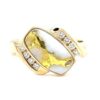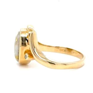 This lady’s gold quartz ring is expertly crafted in 14k yellow gold. This piece features an expertly placed diamond. The smooth, polished surface brilliantly reflects light, capturing attention from every angle. The photos showcase enlarged details of this piece.