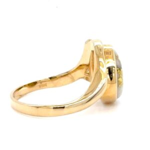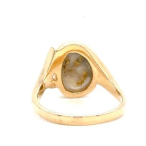 The ring features a natural gemstone known as “Gold Bearing Quartz,” typically mined from deep underground. In most cases, gold found in quartz exists in microscopic amounts, making it virtually invisible. However, this ring boasts an extraordinary rarity as it showcases a very scarce stone that is first cut into slabs, revealing the precious gold vein. Skilled artisans cut, shape, polish, and mount the gold quartz into a 14k gold setting. Embrace the allure of this remarkable Gold Bearing Quartz ring and celebrate the natural beauty of this exceptional gemstone.