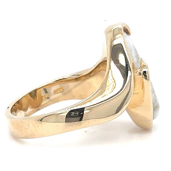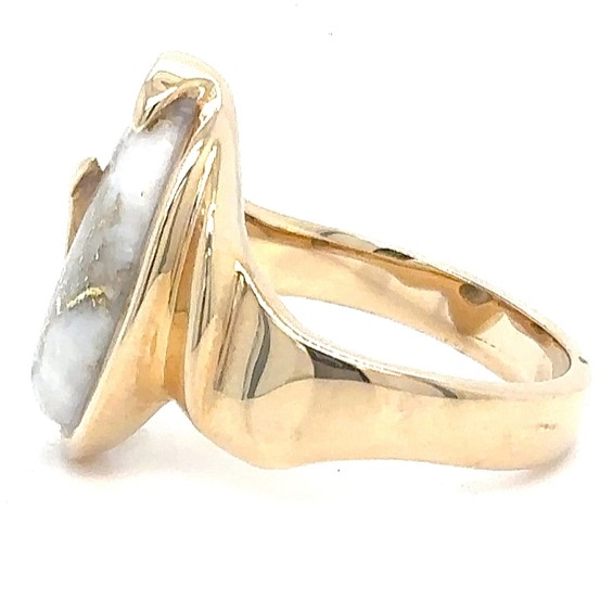 The ring features a natural gemstone known as “Gold Bearing Quartz,” typically mined from deep underground. In most cases, gold found in quartz exists in microscopic amounts, making it virtually invisible. However, this ring boasts an extraordinary rarity as it showcases a very scarce stone that is first cut into slabs, revealing the precious gold vein. Skilled artisans cut, shape, polish, and mount the gold quartz into a 14k gold setting. Embrace the allure of this remarkable Gold Bearing Quartz ring and celebrate the natural beauty of this exceptional gemstone.