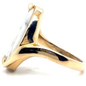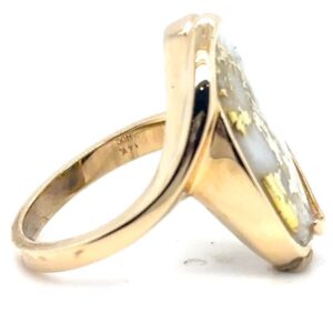 The ring features a natural gemstone known as “Gold Bearing Quartz,” typically mined from deep underground. In most cases, gold found in quartz exists in microscopic amounts, making it virtually invisible. However, this ring boasts an extraordinary rarity as it showcases a very scarce stone that is first cut into slabs, revealing the precious gold vein. Skilled artisans cut, shape, polish, and mount the gold quartz into a 14k gold setting. Embrace the allure of this remarkable Gold Bearing Quartz ring and celebrate the natural beauty of this exceptional gemstone.