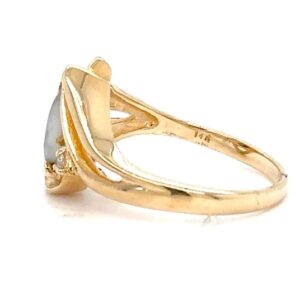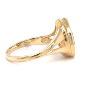 This lady’s gold quartz ring is expertly crafted in 14k yellow gold. This piece features an expertly placed diamond. The smooth, polished surface brilliantly reflects light, capturing attention from every angle. The photos showcase enlarged details of this piece.