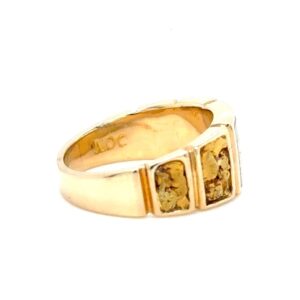 This gold quartz center stone & gold nugget inlaid band is expertly crafted in 14k gold. The photos showcase enlarged details of this exquisite piece.