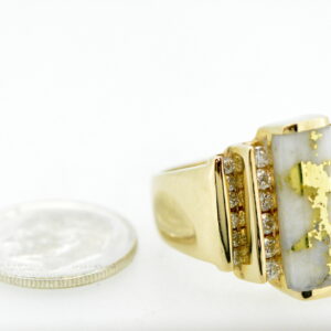 The ring features a natural gemstone known as “Gold Bearing Quartz,” typically mined from deep underground. In most cases, gold found in quartz exists in microscopic amounts, making it virtually invisible. However, this ring boasts an extraordinary rarity as it showcases a very scarce stone that is first cut into slabs, revealing the precious gold vein. Skilled artisans cut, shape, polish, and mount the gold quartz into a 14k gold setting. Embrace the allure of this remarkable Gold Bearing Quartz ring and celebrate the natural beauty of this exceptional gemstone.