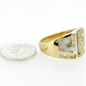 The ring features a natural gemstone known as “Gold Bearing Quartz,” typically mined from deep underground. In most cases, gold found in quartz exists in microscopic amounts, making it virtually invisible. However, this ring boasts an extraordinary rarity as it showcases a very scarce stone that is first cut into slabs, revealing the precious gold vein. Skilled artisans cut, shape, polish, and mount the gold quartz into a 14k gold setting. Embrace the allure of this remarkable Gold Bearing Quartz ring and celebrate the natural beauty of this exceptional gemstone.