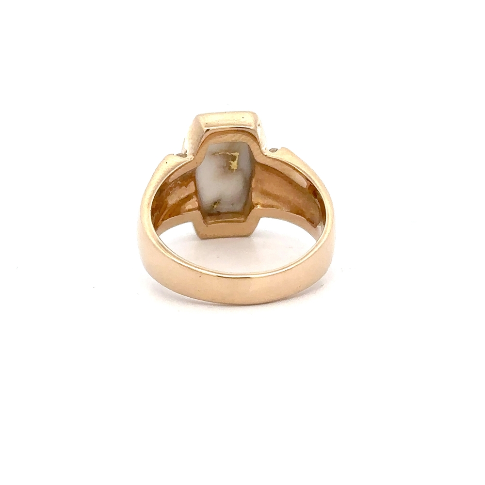 The ring features a natural gemstone known as “Gold Bearing Quartz,” typically mined from deep underground. In most cases, gold found in quartz exists in microscopic amounts, making it virtually invisible. However, this ring boasts an extraordinary rarity as it showcases a very scarce stone that is first cut into slabs, revealing the precious gold vein. Skilled artisans cut, shape, polish, and mount the gold quartz into a 14k gold setting. Embrace the allure of this remarkable Gold Bearing Quartz ring and celebrate the natural beauty of this exceptional gemstone.