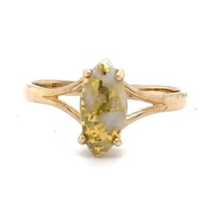 The ring features a natural gemstone known as “Gold Bearing Quartz,” typically mined from deep underground. In most cases, gold found in quartz exists in microscopic amounts, making it virtually invisible. However, this ring boasts an extraordinary rarity as it showcases a very scarce stone that is first cut into slabs, revealing the precious gold vein. Skilled artisans cut, shape, polish, and mount the gold quartz into a 14k gold setting. Embrace the allure of this remarkable Gold Bearing Quartz ring and celebrate the natural beauty of this exceptional gemstone.
