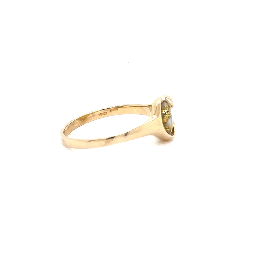 The ring features a natural gemstone known as “Gold Bearing Quartz,” typically mined from deep underground. In most cases, gold found in quartz exists in microscopic amounts, making it virtually invisible. However, this ring boasts an extraordinary rarity as it showcases a very scarce stone that is first cut into slabs, revealing the precious gold vein. Skilled artisans cut, shape, polish, and mount the gold quartz into a 14k gold setting. Embrace the allure of this remarkable Gold Bearing Quartz ring and celebrate the natural beauty of this exceptional gemstone.