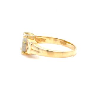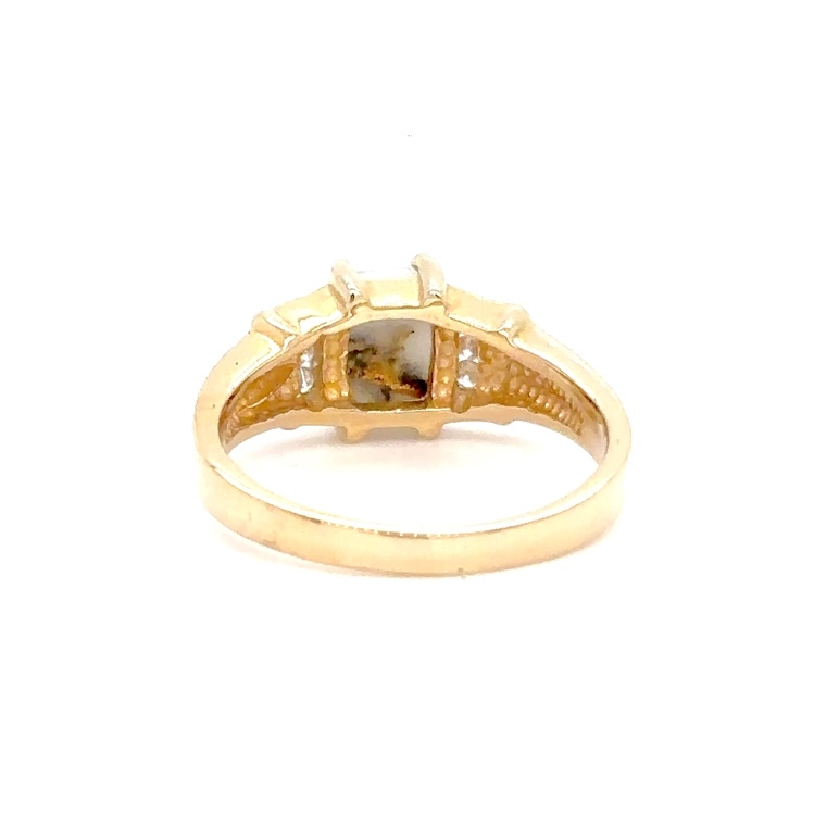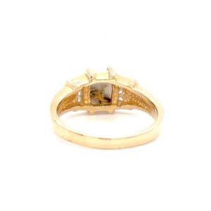 The ring features a natural gemstone known as “Gold Bearing Quartz,” typically mined from deep underground. In most cases, gold found in quartz exists in microscopic amounts, making it virtually invisible. However, this ring boasts an extraordinary rarity as it showcases a very scarce stone that is first cut into slabs, revealing the precious gold vein. Skilled artisans cut, shape, polish, and mount the gold quartz into a 14k gold setting. Embrace the allure of this remarkable Gold Bearing Quartz ring and celebrate the natural beauty of this exceptional gemstone.