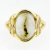 The ring features a natural gemstone known as “Gold Bearing Quartz,” typically mined from deep underground. In most cases, gold found in quartz exists in microscopic amounts, making it virtually invisible. However, this ring boasts an extraordinary rarity as it showcases a very scarce stone that is first cut into slabs, revealing the precious gold vein. Skilled artisans cut, shape, polish, and mount the gold quartz into a 14k gold setting. Embrace the allure of this remarkable Gold Bearing Quartz ring and celebrate the natural beauty of this exceptional gemstone.
