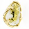 “Gold Bearing Quartz” is a natural gemstone that is usually mined deep underground. Finding snowy white quartz with visible veins of pure gold is extremely difficult. Most of the time, gold mined in quartz is found in microscopic amounts, not at all visible. This very rare stone is cut into slabs, revealing the gold vein, then cut, shaped, polished and mounted into a 14k gold mounting. Because of the veining of the gold, each piece of jewelry is one of a kind. We make this stone into wonderful pieces for both men and women in rings, bracelets, earrings, cuff links, and anything else you might imagine. We can even design a custom piece for you.