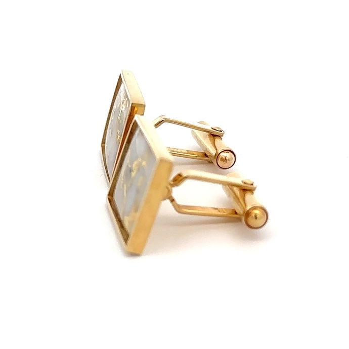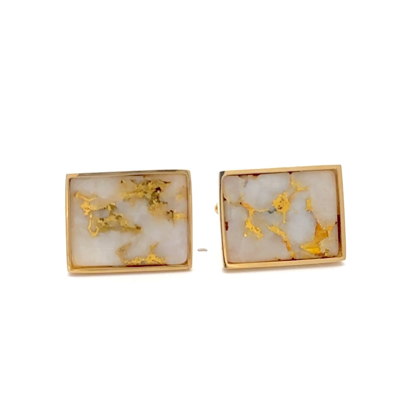 These men’s gold & quartz one-of-a-kind cufflinks are a beautiful set to add to your collection. The 15mm X 19mm natural gold bearing quartz stones are mounted in 18k gold findings and weigh 14.8 grams.