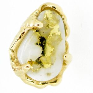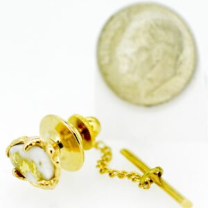 Check out this14k gold tie tack featuring pear shaped gold bearing quartz. It is about 1/2″ tall.