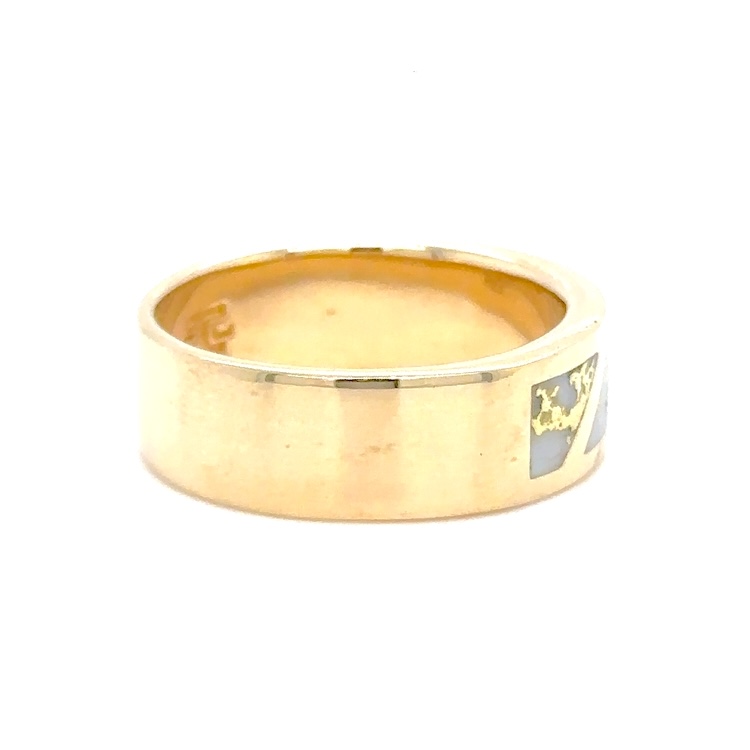 This men’s gold quartz band is expertly crafted in 14k yellow gold. The smooth, polished surface brilliantly reflects light, capturing attention from every angle. The photos showcase enlarged details of this piece.