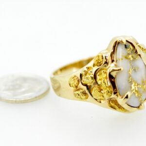 “Gold Bearing Quartz” is a natural gemstone that is usually mined deep underground. Finding snowy white quartz with visible veins of pure gold is extremely difficult. Most of the time, gold mined in quartz is found in microscopic amounts, not at all visible. This very rare stone is cut into slabs, revealing the gold vein. They are then cut, shaped, polished and mounted into a 14k gold mounting. Because of the veining of the gold, each piece of jewelry is one of a kind! We make this rare stone into wonderful pieces for both men and women in rings, bracelets, earrings, cuff links, and anything else you might imagine.