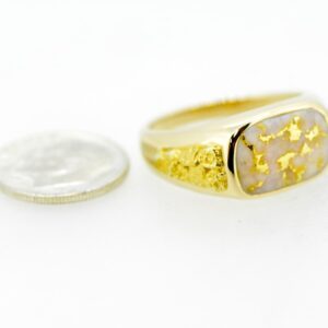 “Gold Bearing Quartz” is a natural gemstone that is usually mined deep underground. Finding snowy white quartz with visible veins of pure gold is extremely difficult. Most of the time, gold mined in quartz is found in microscopic amounts, not at all visible. This very rare stone is cut into slabs, revealing the gold vein. They are then cut, shaped, polished and mounted into a 14k gold mounting. Because of the veining of the gold, each piece of jewelry is one of a kind! We make this rare stone into wonderful pieces for both men and women in rings, bracelets, earrings, cuff links, and anything else you might imagine.