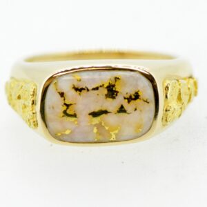 “Gold Bearing Quartz” is a natural gemstone that is usually mined deep underground. Finding snowy white quartz with visible veins of pure gold is extremely difficult. Most of the time, gold mined in quartz is found in microscopic amounts, not at all visible. This very rare stone is cut into slabs, revealing the gold vein. They are then cut, shaped, polished and mounted into a 14k gold mounting. Because of the veining of the gold, each piece of jewelry is one of a kind! We make this rare stone into wonderful pieces for both men and women in rings, bracelets, earrings, cuff links, and anything else you might imagine.