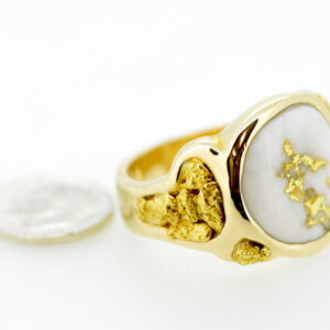 “Gold Bearing Quartz” is a natural gemstone that is usually mined deep underground. Finding snowy white quartz with visible veins of pure gold is extremely difficult. Most of the time, gold mined in quartz is found in microscopic amounts, not at all visible. This very rare stone is cut into slabs, revealing the gold vein. They are then cut, shaped, polished and mounted into a 14k gold mounting. Because of the veining of the gold, each piece of jewelry is one of a kind! We make this rare stone into wonderful pieces for both men and women in rings, bracelets, earrings, cuff links, and anything else you might imagine.
