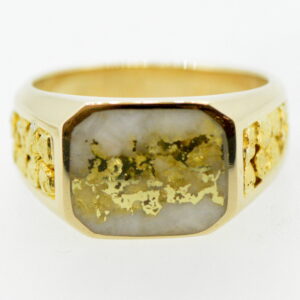 “Gold Bearing Quartz” is a natural gemstone that is usually mined deep underground. Finding snowy white quartz with visible veins of pure gold is extremely difficult. Most of the time, gold mined in quartz is found in microscopic amounts, not at all visible. This very rare stone is cut into slabs, revealing the gold vein. They are then cut, shaped, polished and mounted into a 14k gold mounting. Because of the veining of the gold, each piece of jewelry is one of a kind! We make this rare stone into wonderful pieces for both men and women in rings, bracelets, earrings, cuff links, and anything else you might imagine.