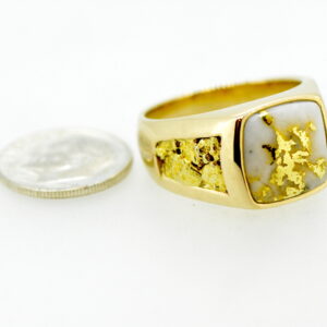 “Gold Bearing Quartz” is a natural gemstone that is usually mined deep underground. Finding snowy white quartz with visible veins of pure gold is extremely difficult. Most of the time, gold mined in quartz is found in microscopic amounts, not at all visible. This very rare stone is cut into slabs, revealing the gold vein. They are then cut, shaped, polished and mounted into a 14k gold mounting. Because of the veining of the gold, each piece of jewelry is one of a kind! We make this rare stone into wonderful pieces for both men and women in rings, bracelets, earrings, cuff links, and anything else you might imagine.