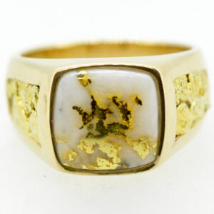 “Gold Bearing Quartz” is a natural gemstone that is usually mined deep underground. Finding snowy white quartz with visible veins of pure gold is extremely difficult. Most of the time, gold mined in quartz is found in microscopic amounts, not at all visible. This very rare stone is cut into slabs, revealing the gold vein. They are then cut, shaped, polished and mounted into a 14k gold mounting. Because of the veining of the gold, each piece of jewelry is one of a kind! We make this rare stone into wonderful pieces for both men and women in rings, bracelets, earrings, cuff links, and anything else you might imagine.