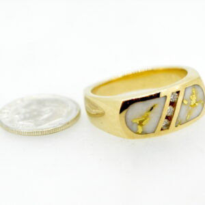 “Gold Bearing Quartz” is a natural gemstone that is usually mined deep underground. Finding snowy white quartz with visible veins of pure gold is extremely difficult. Most of the time, gold mined in quartz is found in microscopic amounts, not at all visible. This very rare stone is cut into slabs, revealing the gold vein. They are then cut, shaped, polished and mounted into a 14k gold mounting. Because of the veining of the gold, each piece of jewelry is one of a kind! We make this rare stone into wonderful pieces for both men and women in rings, bracelets, earrings, cuff links, and anything else you might imagine.