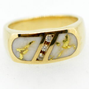 “Gold Bearing Quartz” is a natural gemstone that is usually mined deep underground. Finding snowy white quartz with visible veins of pure gold is extremely difficult. Most of the time, gold mined in quartz is found in microscopic amounts, not at all visible. This very rare stone is cut into slabs, revealing the gold vein. They are then cut, shaped, polished and mounted into a 14k gold mounting. Because of the veining of the gold, each piece of jewelry is one of a kind! We make this rare stone into wonderful pieces for both men and women in rings, bracelets, earrings, cuff links, and anything else you might imagine.