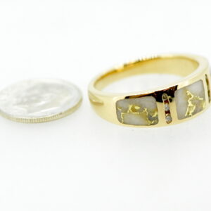 The ring features a natural gemstone known as “Gold Bearing Quartz,” typically mined from deep underground. In most cases, gold found in quartz exists in microscopic amounts, making it virtually invisible. However, this ring boasts an extraordinary rarity as it showcases a very scarce stone that is first cut into slabs, revealing the precious gold vein. Skilled artisans cut, shape, polish, and mount the gold quartz into a 14k gold setting. Embrace the allure of this remarkable Gold Bearing Quartz ring and celebrate the natural beauty of this exceptional gemstone.