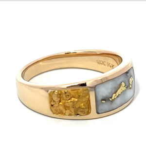 “Gold Bearing Quartz” is a natural gemstone that is usually mined deep underground. Finding snowy white quartz with visible veins of pure gold is extremely difficult. Most of the time, gold mined in quartz is found in microscopic amounts, not at all visible. This very rare stone is cut into slabs, revealing the gold vein. They are then cut, shaped, polished and mounted into a 14k gold mounting. Because of the veining of the gold, each piece of jewelry is one of a kind! We make this rare stone into wonderful pieces for both men and women in rings, bracelets, earrings, cuff links, and anything else you might imagine.