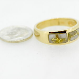 “Gold Bearing Quartz” is a natural gemstone that is usually mined deep underground. Finding snowy white quartz with visible veins of pure gold is extremely difficult. Most of the time, gold mined in quartz is found in microscopic amounts, not at all visible. This very rare stone is cut into slabs, revealing the gold vein. They are then cut, shaped, polished and mounted into a 14k gold mounting. Because of the veining of the gold, each piece of jewelry is one of a kind! We make this rare stone into wonderful pieces for both men and women in rings, bracelets, earrings, cuff links, and anything else you might imagine.