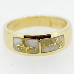 “Gold Bearing Quartz” is a natural gemstone that is usually mined deep underground. Finding snowy white quartz with visible veins of pure gold is extremely difficult. Most of the time, gold mined in quartz is found in microscopic amounts, not at all visible. This very rare stone is cut into slabs, revealing the gold vein. They are then cut, shaped, polished and mounted into a 14k gold mounting. Because of the veining of the gold, each piece of jewelry is one of a kind! We make this rare stone into wonderful pieces for both men and women in rings, bracelets, earrings, cuff links, and anything else you might imagine.