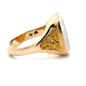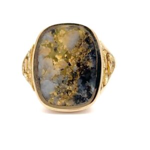 This men’s gold quartz ring is expertly crafted in 14k yellow gold. This is a rare specimen of gold quartz that features white, gray, and black overtones in the stone. This stone was mined in the Dome mine in Timmins, Ontario, in the mid-80s. Another feature on this ring is raw Klodnike gold nuggets on both sides of the 14k setting. The smooth, polished surface brilliantly reflects light, capturing attention from every angle. The photos showcase enlarged details of this piece. Sizing may be available for an additional cost. Size 14.