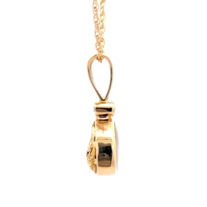 This pendant features one side that has gold bearing quartz and the reverse features gold nugget inlay. Both sides are set in 14k yellow gold with an accent diamond and it comes with a complementary 14k plated 18in chain. It has a large bail to fit multiple different sized chains. It is over an inch tall including the bail and over 1/4 inch thick. The smooth, polished surface brilliantly reflects light, capturing attention from every angle. The photos showcase enlarged details of this beautiful piece.