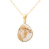 The pendant features a natural gemstone known as “Gold Bearing Quartz,” typically mined from deep underground. In most cases, gold found in quartz exists in microscopic amounts, making it virtually invisible. However, this pendant boasts an extraordinary rarity as it showcases a very scarce stone that is first cut into slabs, revealing the precious gold vein. Subsequently, skilled artisans cut, shape, polish, and mount it into a 14k gold setting. Embrace the allure of this remarkable Gold Bearing Quartz pendant and celebrate the natural beauty of this exceptional gemstone.