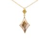 This is a pear-shaped pendant made of gold quartz, accompanied by a halo of diamonds, all set in a fluid 14k yellow gold setting, and comes with a 14k gold-plated chain. The smooth, polished surface brilliantly reflects light, capturing attention from every angle. The photos showcase enlarged details of this beautiful piece. This piece is about an inch tall.