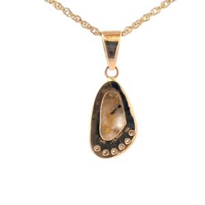 The pendant features a natural gemstone known as “Gold Bearing Quartz,” typically mined from deep underground. In most cases, gold found in quartz exists in microscopic amounts, making it virtually invisible. However, this pendant boasts an extraordinary rarity as it showcases a very scarce stone that is first cut into slabs, revealing the precious gold vein. Subsequently, skilled artisans cut, shape, polish, and mount it into a 14k gold setting. Embrace the allure of this remarkable Gold Bearing Quartz pendant and celebrate the natural beauty of this exceptional gemstone.