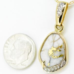 The pendant features a natural gemstone known as “Gold Bearing Quartz,” typically mined from deep underground. In most cases, gold found in quartz exists in microscopic amounts, making it virtually invisible. However, this pendant boasts an extraordinary rarity as it showcases a very scarce stone that is first cut into slabs, revealing the precious gold vein. Subsequently, skilled artisans cut, shape, polish, and mount it into a 14k gold setting. Embrace the allure of this remarkable Gold Bearing Quartz pendant and celebrate the natural beauty of this exceptional gemstone.