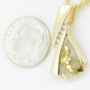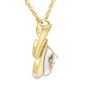 The pendant features a natural gemstone known as “Gold Bearing Quartz,” typically mined from deep underground. In most cases, gold found in quartz exists in microscopic amounts, making it virtually invisible. However, this pendant boasts an extraordinary rarity as it showcases a very scarce stone that is first cut into slabs, revealing the precious gold vein. Subsequently, skilled artisans cut, shape, polish, and mount it into a 14k gold setting. Embrace the allure of this remarkable Gold Bearing Quartz pendant and celebrate the natural beauty of this exceptional gemstone.
