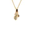 This is a teardrop pendant made of gold quartz and surrounded by diamonds, set in a 14k yellow gold setting, and comes with a 14k gold-plated chain. The smooth, polished surface brilliantly reflects light, capturing attention from every angle. The photos showcase enlarged details of this beautiful piece. This piece is about an inch tall.