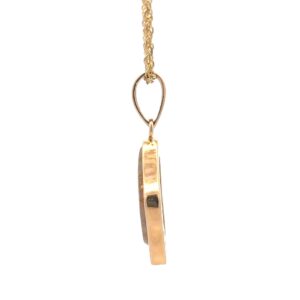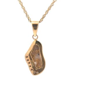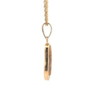 The pendant features a natural gemstone known as “Gold Bearing Quartz,” typically mined from deep underground. In most cases, gold found in quartz exists in microscopic amounts, making it virtually invisible. However, this pendant boasts an extraordinary rarity as it showcases a very scarce stone that is first cut into slabs, revealing the precious gold vein. Subsequently, skilled artisans cut, shape, polish, and mount it into a 14k gold setting. Embrace the allure of this remarkable Gold Bearing Quartz pendant and celebrate the natural beauty of this exceptional gemstone.