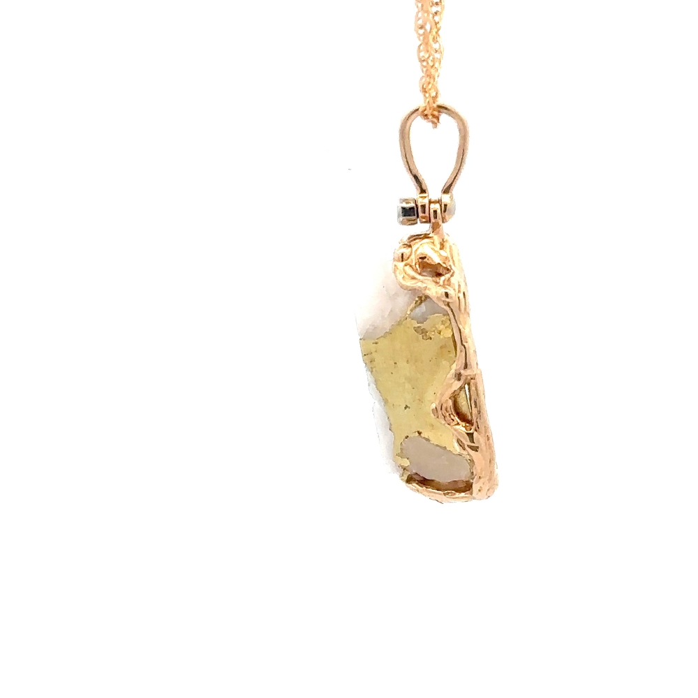 The pendant features a natural gemstone known as “Gold Bearing Quartz,” typically mined from deep underground. In most cases, gold found in quartz exists in microscopic amounts, making it virtually invisible. However, this pendant boasts an extraordinary rarity as it showcases a very scarce stone that is first cut into slabs, revealing the precious gold vein. Subsequently, skilled artisans cut, shape, polish, and mount it into a 14k gold setting. Embrace the allure of this remarkable Gold Bearing Quartz pendant and celebrate the natural beauty of this exceptional gemstone.